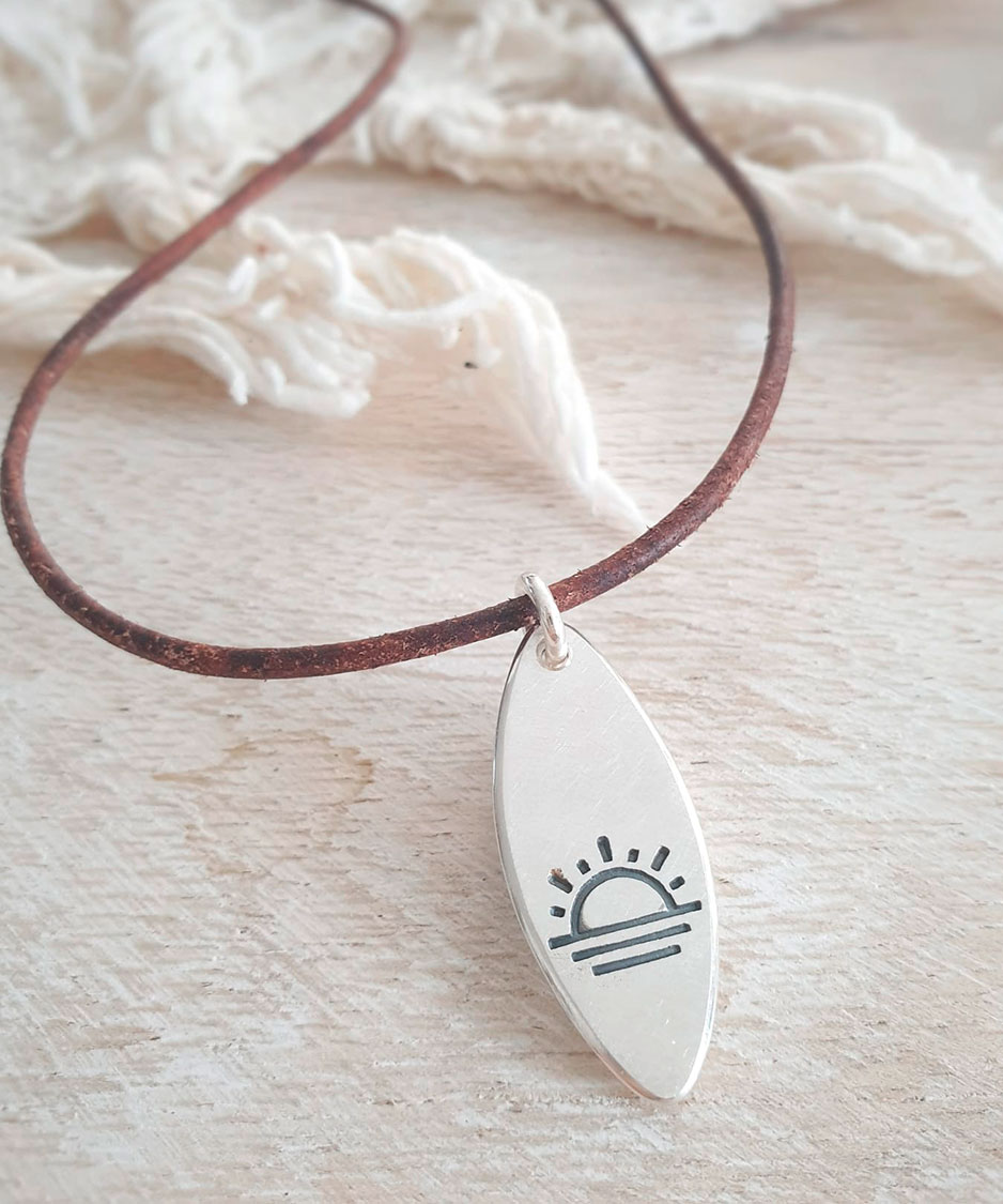Anhänger in Surfboard-Form mit dem Sujet «Sunset» an Lederband